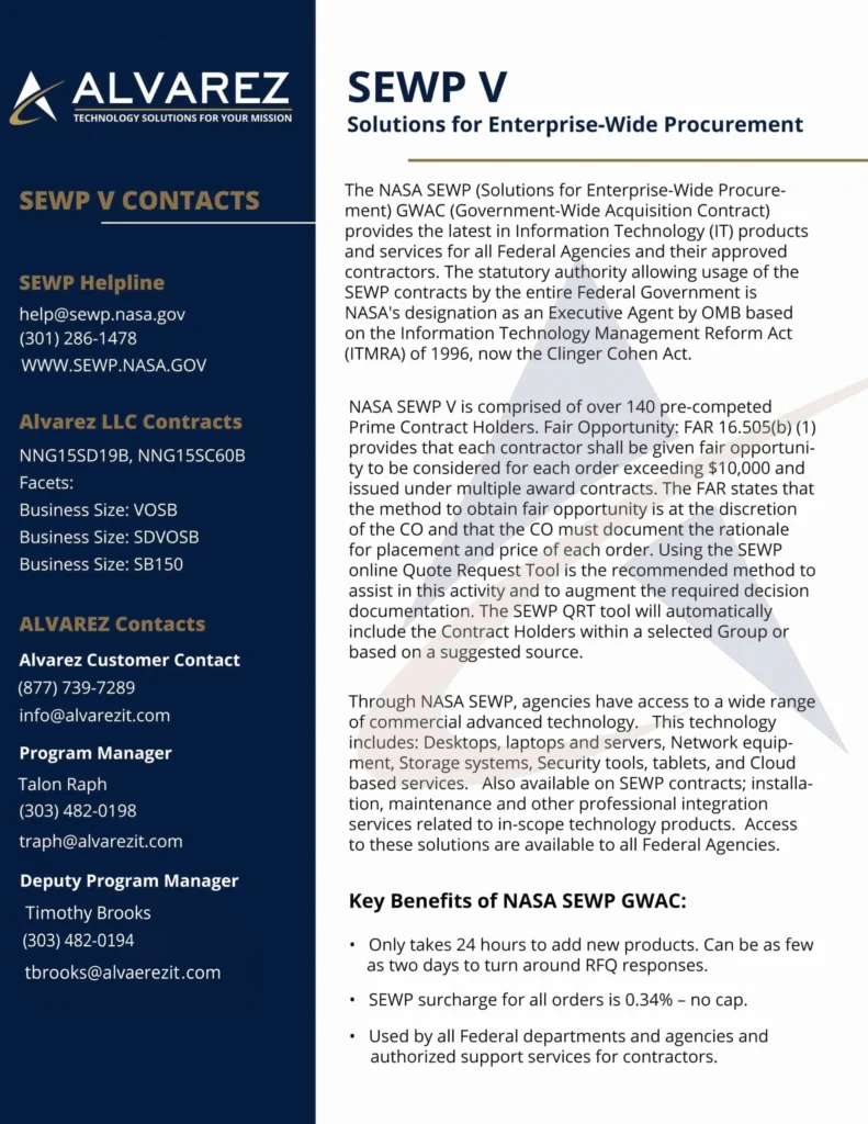 Alvarez LLC was awarded both the Group B – SDVO/SB and the Group C – Server Support Devices/Multi-Functional Device contracts for the NASA SEWP V GWAC on April 1, 2015.